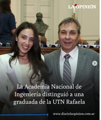 Presso l’Aula Magna dell’Accademia Nazionale di Medicina a Buenos Aires, Bianca è stata insignita del premio “Ing. Isidoro Marín”, destinato ai migliori laureati delle facoltà di ingegneria di tutto il Paese. Un traguardo straordinario che la colloca tra i 63 migliori profili tecnici su scala nazionale.